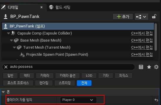 2. 디테일 패널에서 "auto possess player" 검색