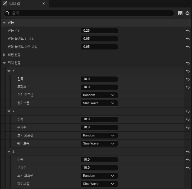 디테일 패널에서 카메라 진동 효과를 설정해주고, 호출은 C++로 작성한다.