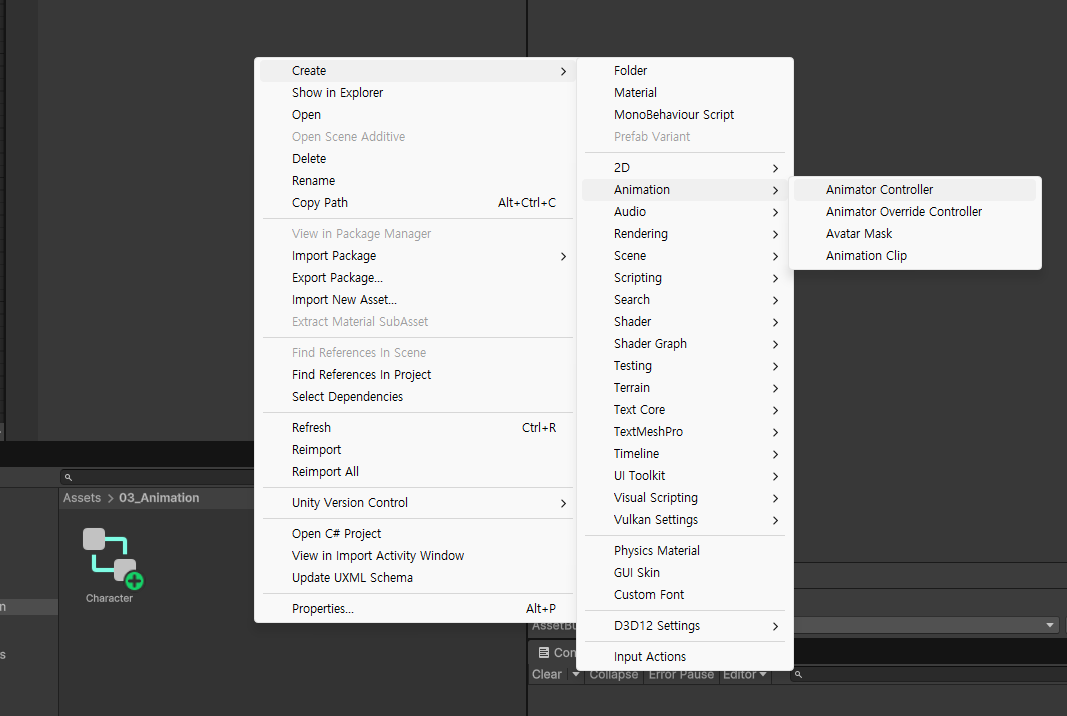 이제 에디터에서 애니메이터 컨트롤러를 생성한다.