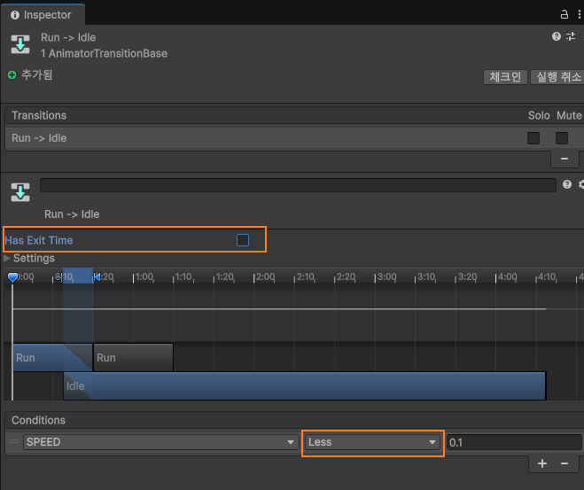 Has Exit Time을 끄고, 조건을 통해서 전환 규칙을 설정한다.