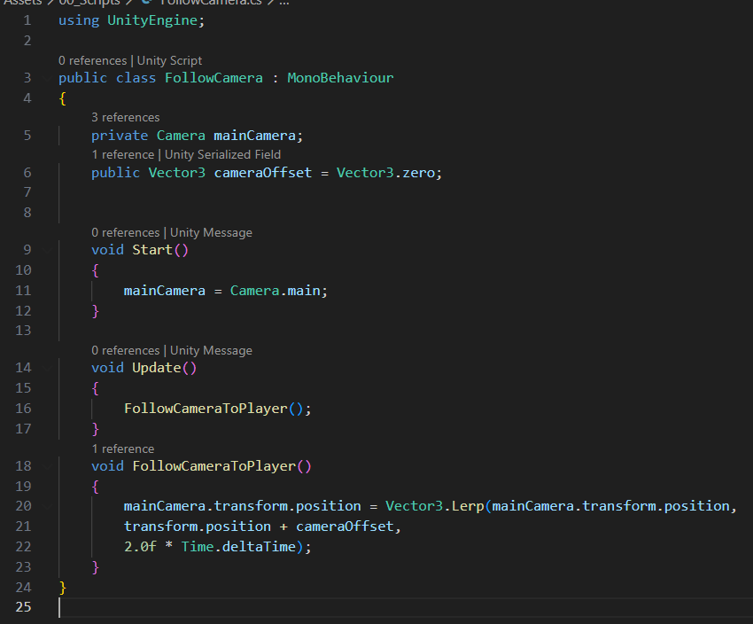 스크립트로 가서, Start 함수에서 메인 카메라를 가져오고, Lerp를 통해 카메라의 위치를 설정