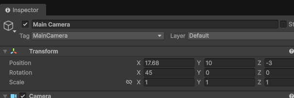 TopView 시점에서 카메라는 X축으로 45 ~ 55도 정도를 설정하는 편이다.