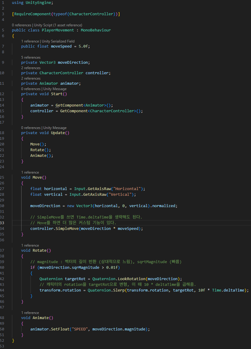 회전 : moveDirection의 크기가 0.01 이상이라는 건 입력이 들어왔다는 뜻이므로, 입력이 들어오면 moveDirection의 Vector 값을 쿼터니온(사원수) 회전 값으로 변경하고, 이를 캐릭터의 트랜스폼의 회전 값에 선형보간법을 이용해 부드럽게 전환되도록 한다.
