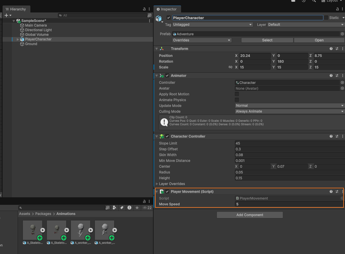 이제 코드를 기본적인 이동, 회전, 애니메이션 코드를 작성한다.