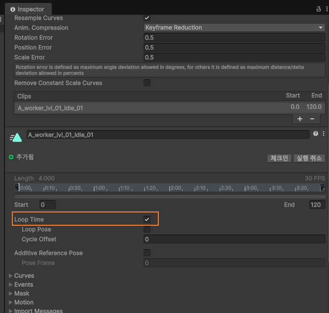 Idle 애니메이션을 더블클릭하면 우측 Inspector에서 Loop를 설정할 수 있다.