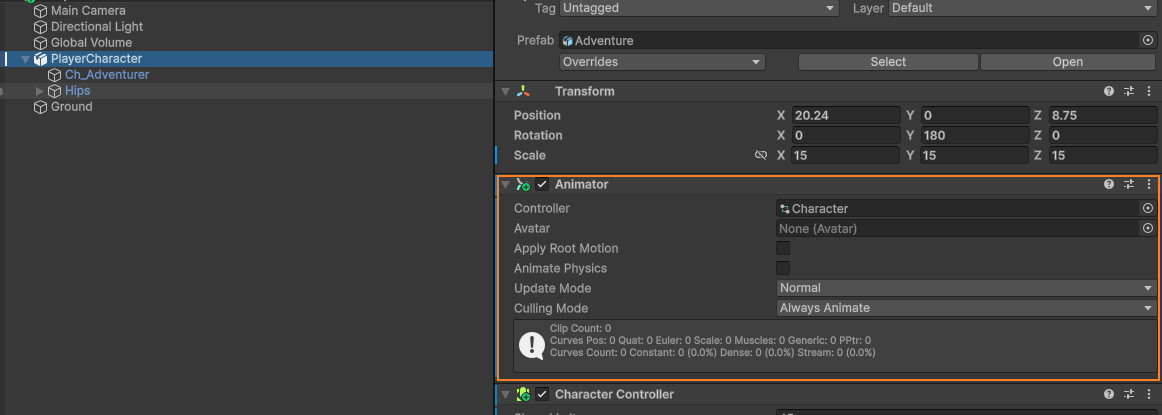 생성한 애니메이터 컨트롤러를 하이어라키의 캐릭터에게 넣어서 컴포넌트로 추가해준다.