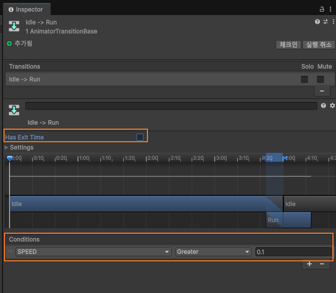 그러면 Idle에서 Run 애니메이션으로 전환되는 조건은 SPEED가 0.1 이상일 때 바뀐다는 설정이 된다.