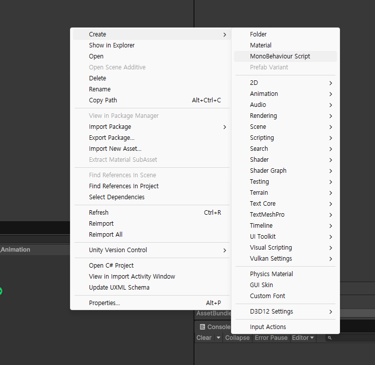 그 다음으로 Project 폴더에서 마우스 우클릭으로 - MonoBehaviour 스크립트를 추가한다.