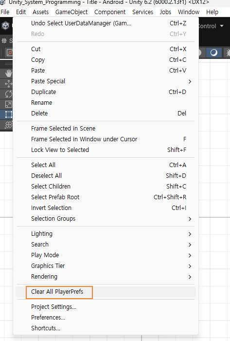 이 때는 유니티 에디터에서 Edit - Clear All PlayerPrefs를 눌러 정리할 수 있다.