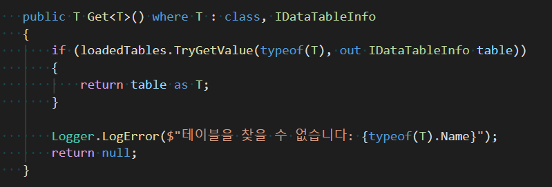 이를 위해 매니저 클래스에 Get 함수를 만들어준다. IDataTableInfo를 상속받은 클래스라면, T 타입으로 변환할 수 있으면 변환해서 넘겨준다.