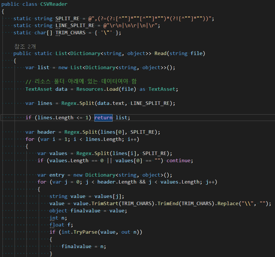 파일 경로를 전달해주면 Resources.Load() 함수를 사용해 TextAsset으로 가져오고 여기서 텍스트를 추출하면 csv 파일의 데이터가 행 한 줄씩 쭈욱 이어 붙인 길다한 한 줄의 텍스트가 된다. 이걸 규칙에 맞게 열 단위로 구분하고 행 단위로 잘라내는 방식이다.