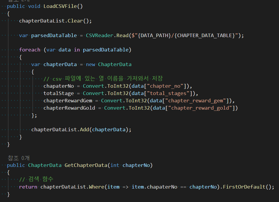 그리고 이 csv 파일에 데이터를 저장하고 관리할 ChapterDataTable 클래스는 IDataTableInfo를 상속받는다.