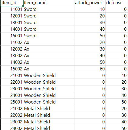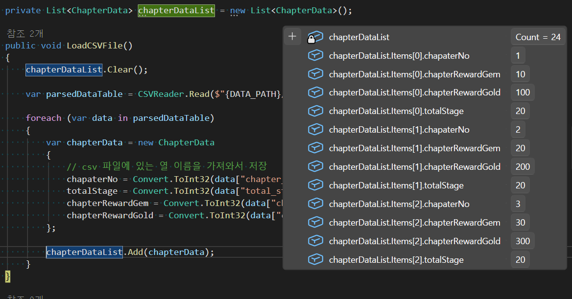 이렇게 Load 함수를 정의하고 추가 작업 없이 빌드하고 게임 실행하면 csv 파일 데이터가 잘 저장되는 것을 확인할 수 있다.
