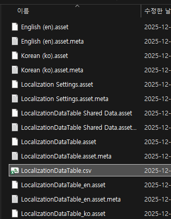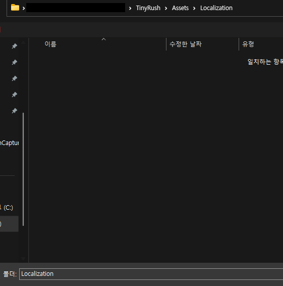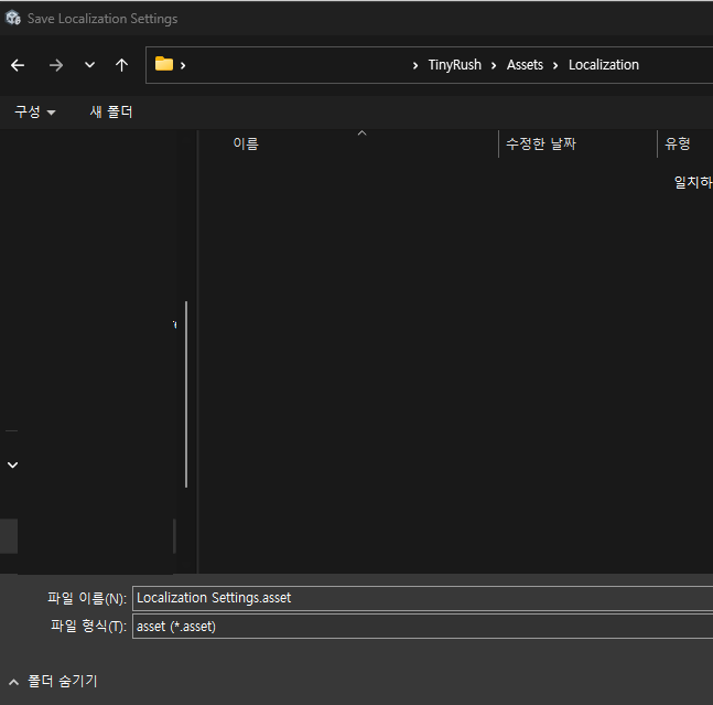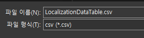 클릭하면 저장 위치를 선택하라고 뜨는데, Asset 폴더 하위에 Localization 폴더를 만들어서 관리하는 것을 추천합니다.