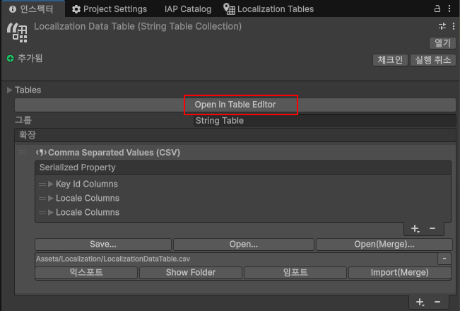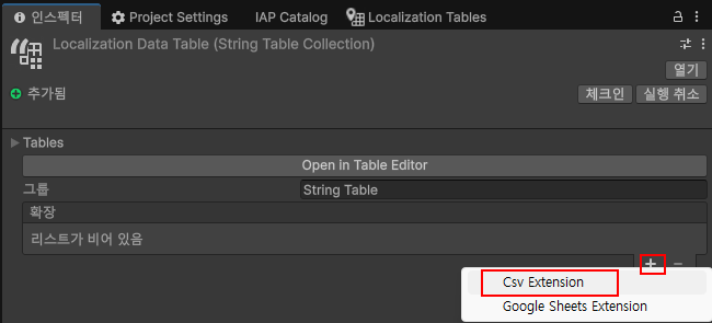 8. Localization Table에서 csv Extention을 추가합니다.
