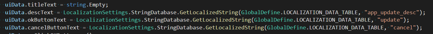 결국 Localization Table 이름을 모든 코드에 반복해서 사용해야 하므로 const string으로 설정하는 것이 편합니다.