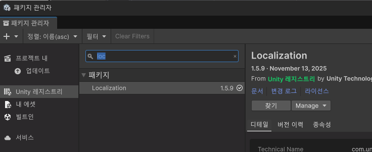 1. 메뉴 Window - PakageManagement - Unity Registry에서 Localization 검색 후 설치