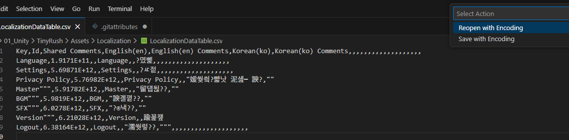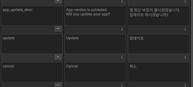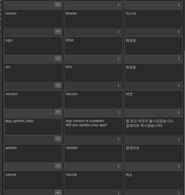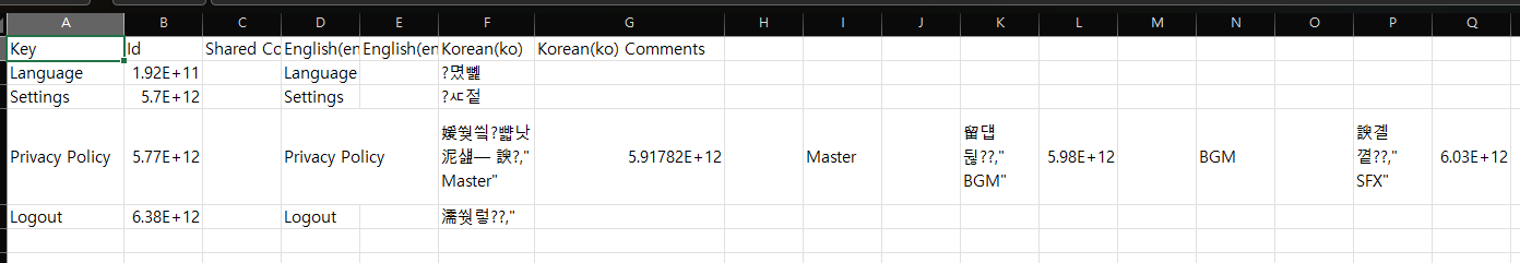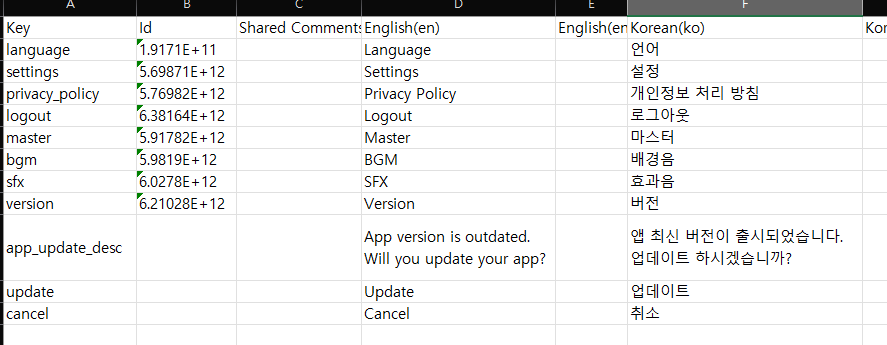 이러한 방식으로 현지화 작업을 해줘도 상관 없지만, 역시 데이터를 표로 관리할 때는 엑셀과 같은 csv 파일로 관리하는 것이 편리합니다.