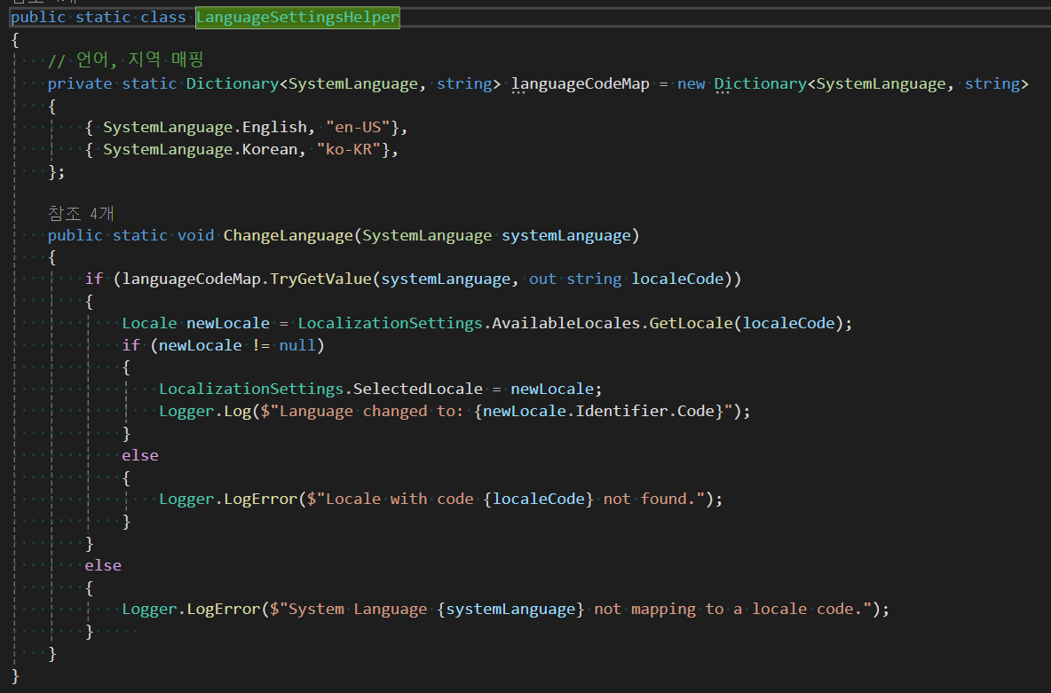 ChangeLanguage 함수는 SystemLanguage를 매개변수로 넣어주면, 매핑된 현지 코드를 LocalizationSettings.SelectedLocale에 대입합니다.