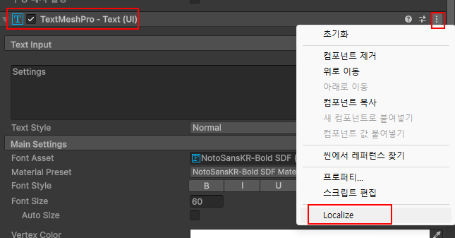 11. TextMeshPro에서 설정 - Localize 클릭