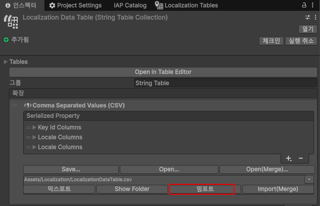 9. Localization Table 인스펙터 창에서 csv 파일을 임포트합니다.