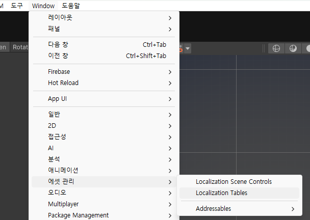 2. 메뉴 Window - Asset Management - Localization Tables 클릭