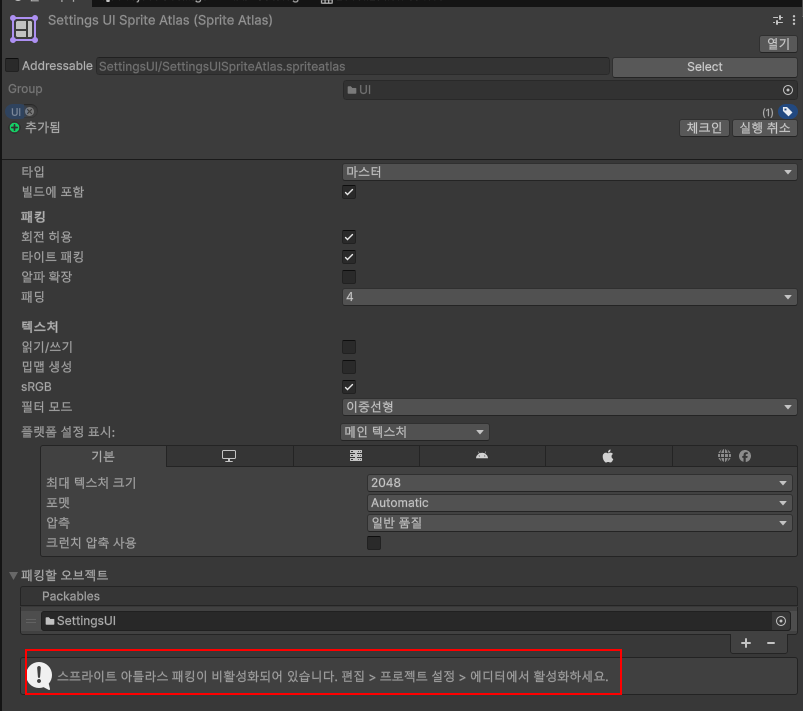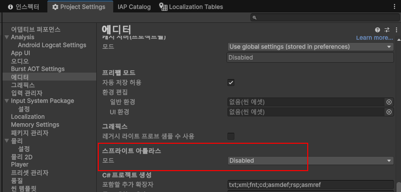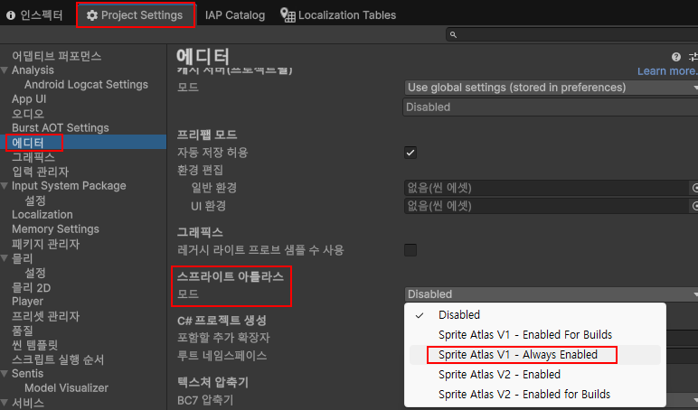 1. 메뉴 - Edit - Project Settings - Editor - Sprite Atlas - Mode 변경