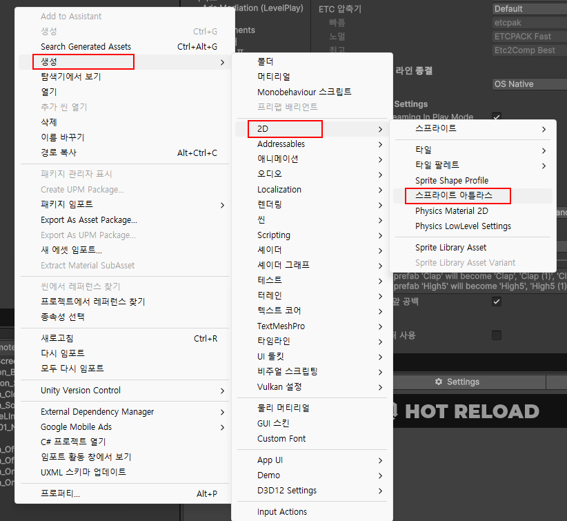 2. 프로젝트 폴더 우클릭 - Create - 2D - Spirte Atlas