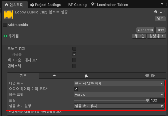 사운드의 경우, 플랫폼에 관계없이 아래와 같이 설정합니다.