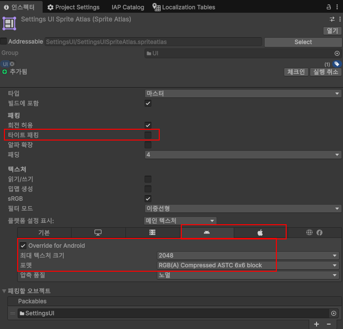 4. Sprite Altas의 플랫폼 별 Override for Platform을 체크합니다.