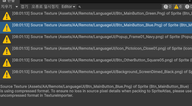 그러면 콘솔 창에 경고가 뜰 수 있습니다. 이는, 이미지 파일이 이미 압축된 상태인데, 또 아틀라스로 압축을 하면 이미지 품질이 낮아질 수 있다는 경고입니다. 원본 이미지 파일의 인스펙터 창에서 압축 품질을 사용 안함을 선택하는 방법도 있는데 선택사항입니다.