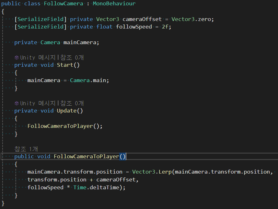 이 로직에서는 선형보간법(Lerp)을 사용하여 카메라 플레이어보다 약간 느리게 따라가며 부드러운 카메라 이동을 구현합니다.