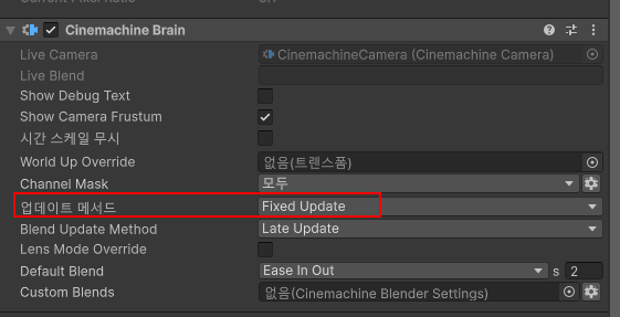 여기서, 만약 플레이어의 이동 연산을 FixedUpdate 함수에서 처리해주고 있다면, 카메라의 Update 함수도 FixedUpdate로 동일하게 맞춰서 카메라 혹은 캐릭터의 떨림 현상을 해소할 수 있습니다.