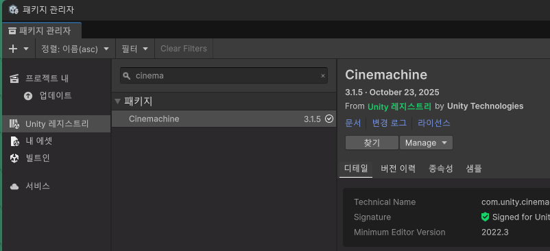 먼저 이 기능을 사용하기 위해서는 메뉴 Window - PakageManager 에서 유니티 레지스트리에서 cinemachine을 검색하여 플러그인을 설치해줘야 합니다.