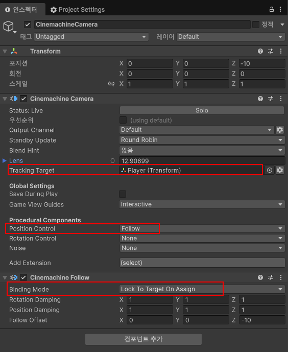 이후 Position Control을 Follow로 변경하면, 하단에 시네머신 팔로우라는 스크립트가 추가됩니다.